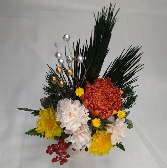 オレンジ系の輪菊で太陽をイメージして明るく華やかな印象に。